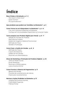 O documento "Guia do Infoprodutor" é um PDF destinado a criadores da plataforma Edutecka. Com estrutura clara, abrange desde início na plataforma até estratégias para vendas de infoprodutos. Inclui tópicos sobre criação de conta, marketing, gestão de vendas, pagamentos, e normas da plataforma. Desenhado para ser um recurso abrangente, é uma ferramenta para infoprodutores que buscam maximizar sua presença e lucratividade na Edutecka.